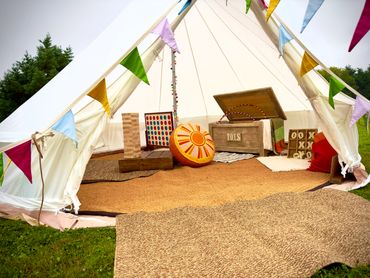 Our 'Children's Play Tent' is a 4m bell tent decorated with bunting and fairy lights, has cushions, bean bags & throws scattered throughout and comes jam packed full of games and activities for your little ones to enjoy.